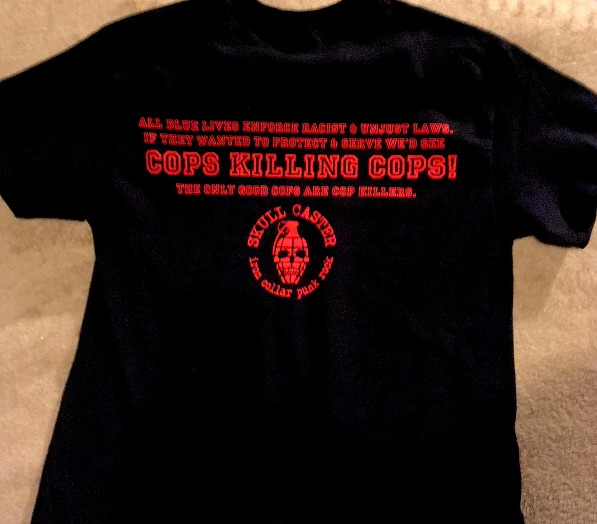 Back reads: " All blue lives enforce racist & unjust laws. If they wanted to protect & serve we'd see COPS KILLING COPS! The only good cops are cop killers."